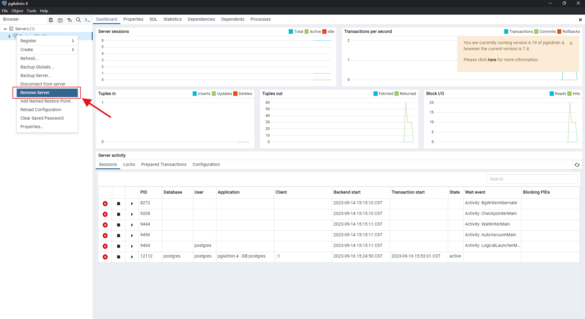 3.關(guān)閉文檔并選擇保存,然后再回到網(wǎng)絡(luò)版數(shù)據(jù)庫,右鍵點(diǎn)擊postgresql 15,在展開菜單中左鍵點(diǎn)擊remove server,然后選擇yes,就能重啟服務(wù)器(重啟需要一段時間)。