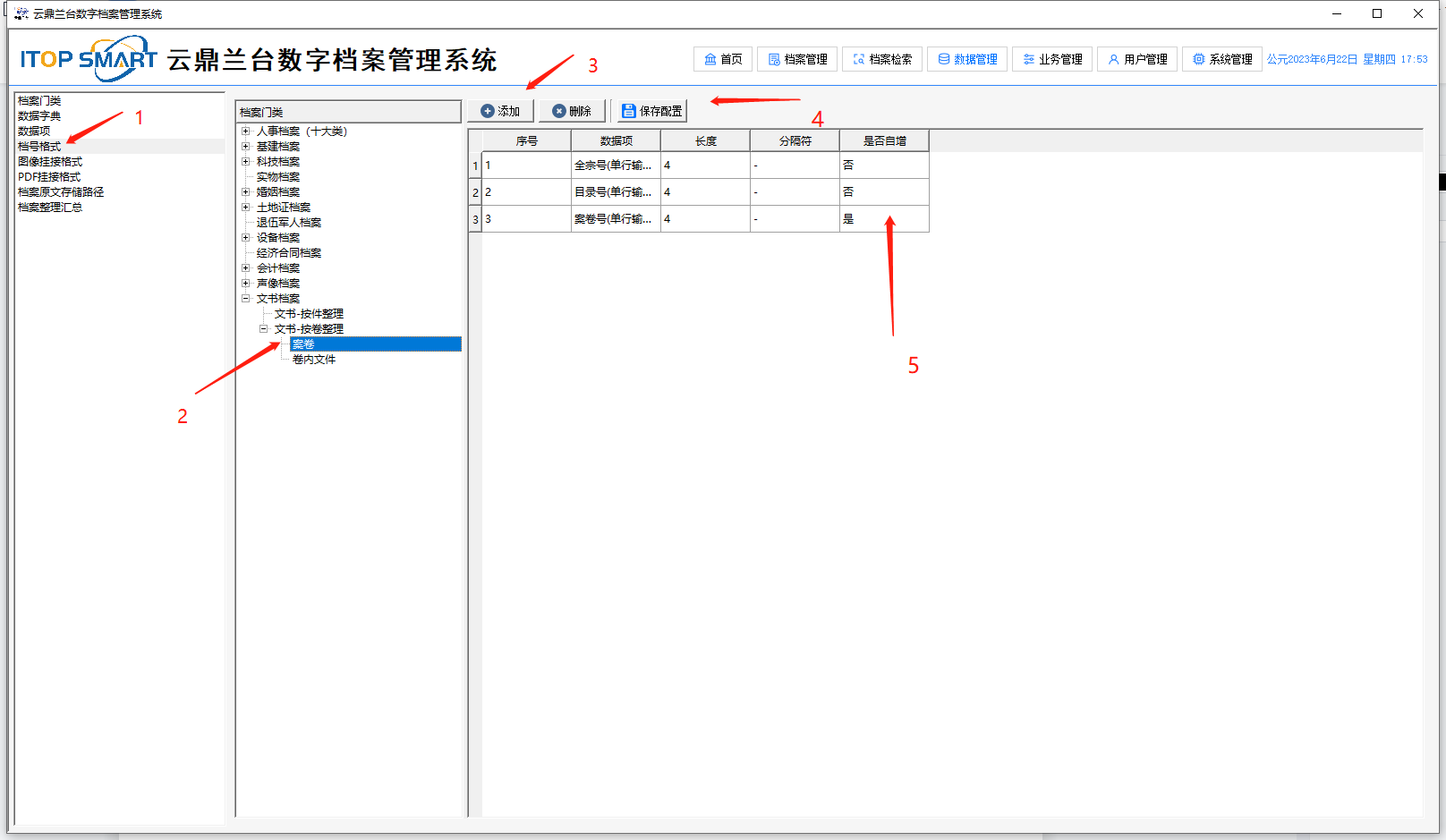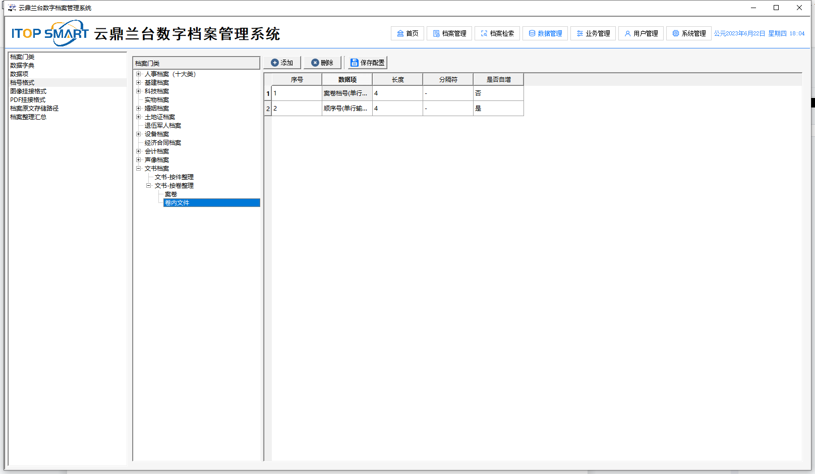 1,點擊檔號格式,選擇需要配置檔號格式的檔案門類,點擊添加進行檔號格式配置,案卷級檔案的案卷配置案卷檔號,案卷號是否自增選擇是,卷內(nèi)文件配置卷內(nèi)檔號,順序號或件號是否自增選擇是。一文一件級檔案只需配置檔號,件號的是否自增選擇是。記得配置完成后一定要點擊保存配置。(檔號的格式以實物為準,且檔號組成必須為已添加的數(shù)據(jù)項)