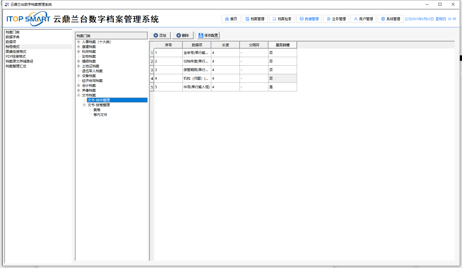1,打開數(shù)字檔案管理系統(tǒng),點擊數(shù)據(jù)管理,再點擊檔案門類,進入檔案門類配置界面。