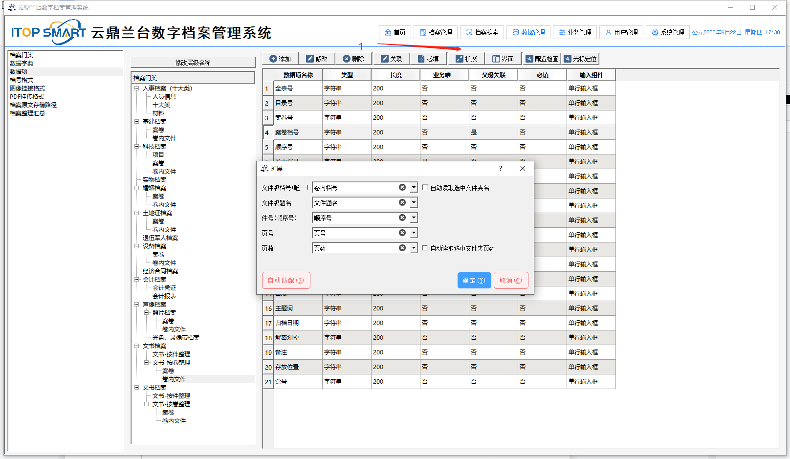 配置完成后點擊擴展,在彈出界面點擊自動匹配進行拓展,若因數(shù)據(jù)項名稱差異配匹配失敗可手動選擇,匹配完成后點擊確定,案卷數(shù)據(jù)相配完成。