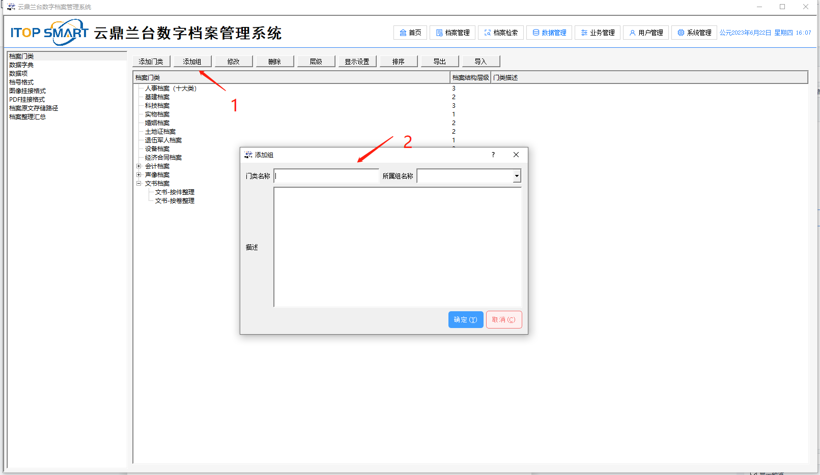 2,然后根據(jù)檔案類型包含的案卷或一文一件檔案的數(shù)量去決定添加組再在組下面建立檔案門類,還是直接建立檔案門類(每個組可以包含多個門類,門類下面不可包含組)。