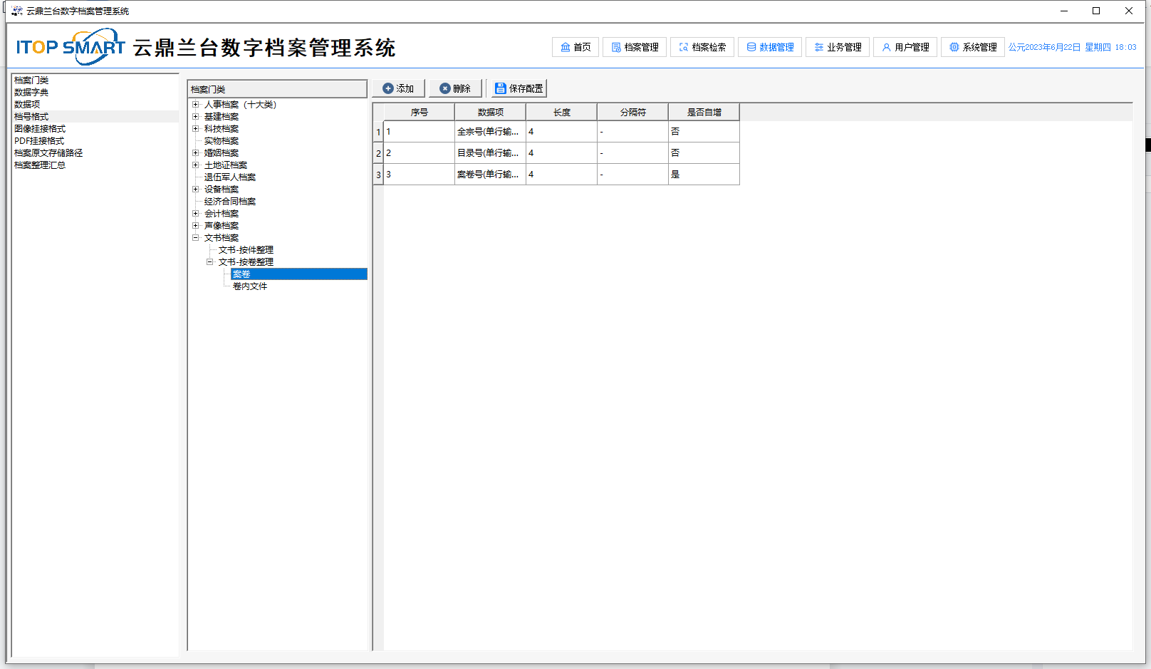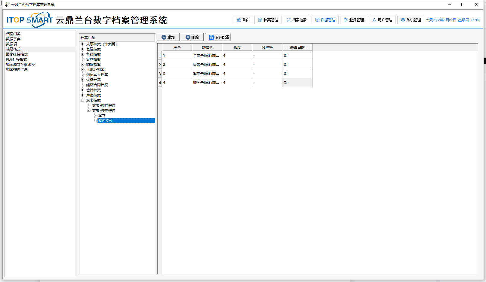 1,點擊檔號格式,選擇需要配置檔號格式的檔案門類,點擊添加進(jìn)行檔號格式配置,案卷級檔案的案卷配置案卷檔號,案卷號是否自增選擇是,卷內(nèi)文件配置卷內(nèi)檔號,順序號或件號是否自增選擇是。一文一件級檔案只需配置檔號,件號的是否自增選擇是。記得配置完成后一定要點擊保存配置。(檔號的格式以實物為準(zhǔn),且檔號組成必須為已添加的數(shù)據(jù)項)
