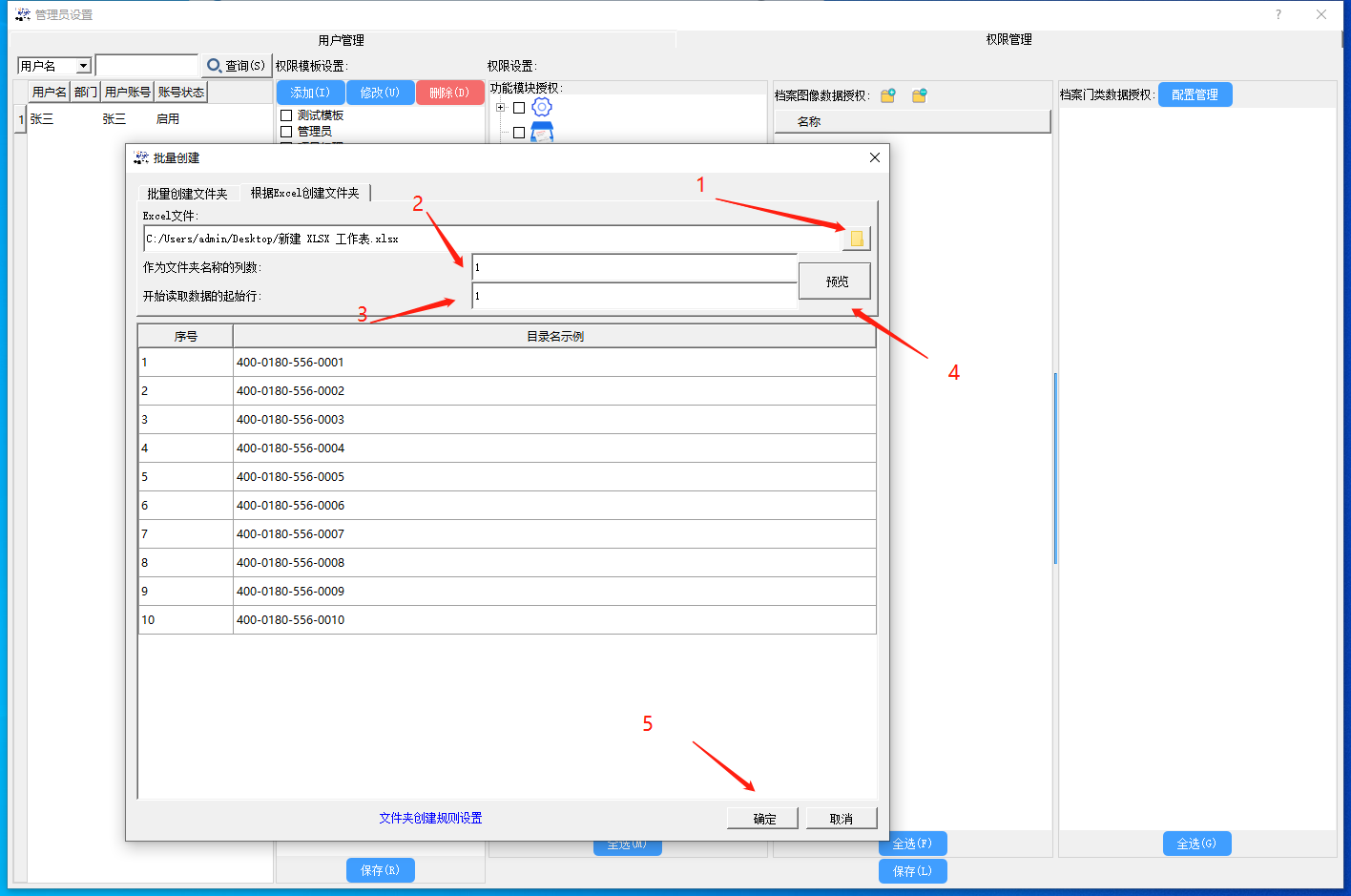 (6)點擊excel文件空白欄后面的小文件夾圖標(biāo)選擇提前建立的完全檔號excel表格,作為文件夾名稱的列數(shù)選擇表格內(nèi)完全檔號所在的列數(shù),開始讀取數(shù)據(jù)的起始行選擇完全檔號起始行所在的行數(shù),點擊預(yù)覽,查看目錄行示例是否正確,如若正確,點擊確定開始創(chuàng)建文件夾。