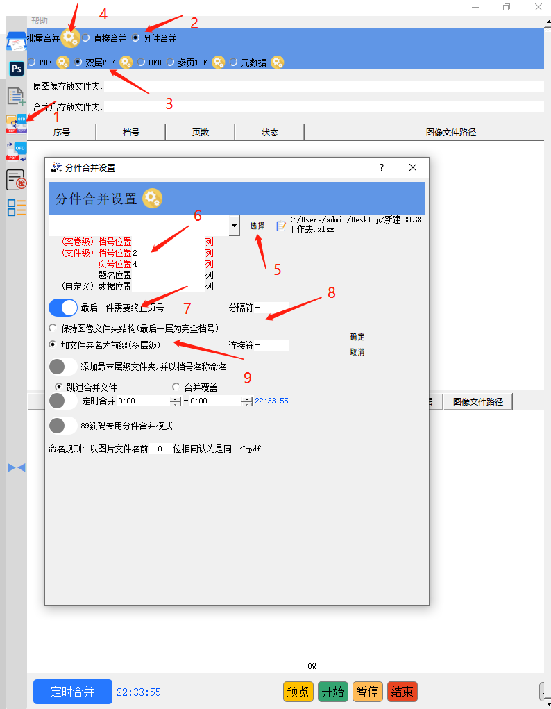 (1)點擊批量合并模塊,合并一文一件檔案就選擇直接合并,合并案卷級檔案就選擇分件合并,然后選擇合并為雙層pdf或者是元數(shù)據(jù),點擊設(shè)置按鍵,選擇圖片對應(yīng)的卷內(nèi)目錄excel文件(可由著錄界面直接導(dǎo)出),然后再分別填入excel文件中案卷級檔號,文件級檔號,頁號所在的列數(shù),打開最后一頁需要終止頁號的選項,并且為其添加分隔符為“-”,然后根據(jù)自己的原圖像的儲存文件路徑的最后一級是否為完全檔號,去選擇是否保持文件夾結(jié)構(gòu),所有選項完成后,點擊確認(rèn)進(jìn)行保存,然后再選擇圖像的儲存路徑(注意,文件夾選擇為完整檔號結(jié)構(gòu)第一個數(shù)據(jù)項的上一層文件夾),選擇合并數(shù)據(jù)的儲存路徑,點擊預(yù)覽看是否能夠預(yù)覽,若不能則上述步驟出現(xiàn)錯誤,需要檢查,若能預(yù)覽出來,測點擊開始,開始合并。