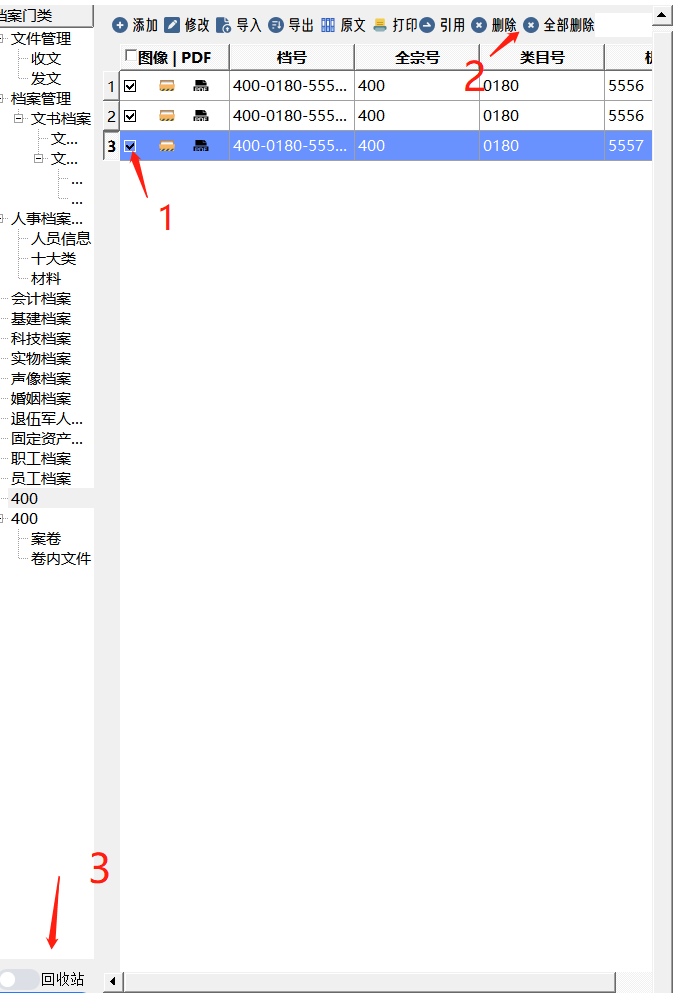 (9)刪除:刪除勾選的著錄信息,全部刪除:刪除已選擇的門類的所有著錄信息,刪除的信息會在回收站中,打開回收站,選擇剛剛進(jìn)行刪除操作的門類,就能看到刪除的信息,可點擊恢復(fù)數(shù)據(jù)。必須先刪除回收站內(nèi)信息的情況下,再能再次導(dǎo)入相同信息。