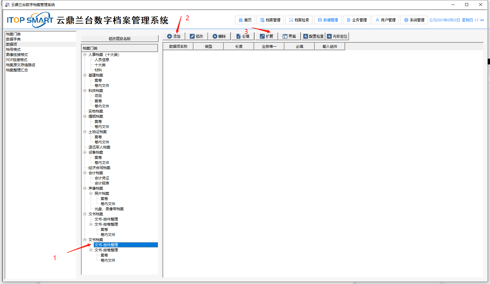 點擊創(chuàng)建的一文一件級檔案,點擊添加進(jìn)行數(shù)據(jù)項的配置,配置完成后點擊擴(kuò)展進(jìn)行匹配,完成數(shù)據(jù)項的配置。