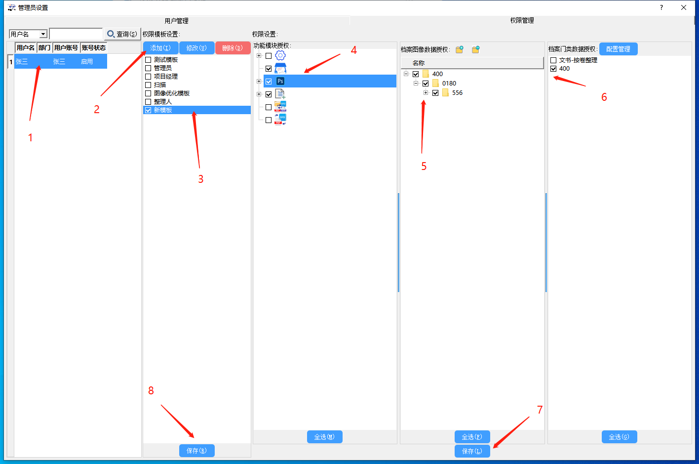 在管理員設(shè)置界面,點擊勾選用戶,在權(quán)限模板設(shè)置欄點擊添加為其添加權(quán)限模板,權(quán)限模板可以直接套用已存在的模板(模板包括功能模塊授權(quán),檔案圖像數(shù)據(jù)授權(quán),檔案門類數(shù)據(jù)授權(quán)的權(quán)限分配設(shè)置),也可自己添加新模板:點擊添加,添加新權(quán)限模板,選擇新權(quán)限模板,在功能模塊授權(quán)欄,檔案圖像數(shù)據(jù)授權(quán)欄和檔案門類數(shù)據(jù)授權(quán)欄為其分配權(quán)限,分配完成后,先點擊右側(cè)保存鍵保存模板的權(quán)限分配選擇,再點擊左側(cè)保存鍵保存賬號的模板選擇。