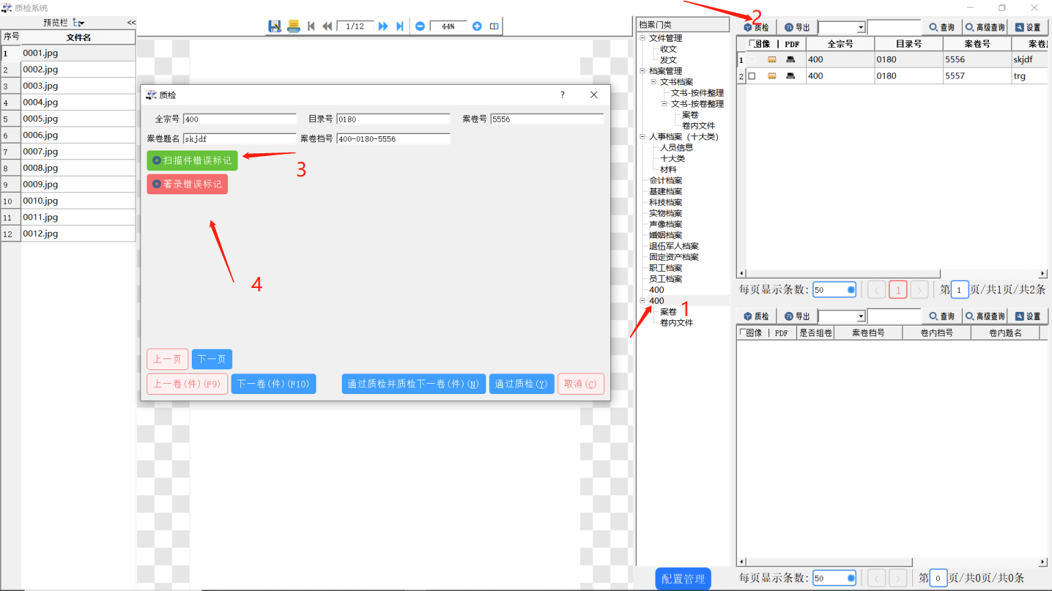 通常在掃描與著錄完成后,我們需要的掃描與著錄的結(jié)果進(jìn)行質(zhì)檢,點擊質(zhì)檢模塊進(jìn)入質(zhì)檢界面,點擊選擇一個門類,點擊質(zhì)檢開始對此門類的質(zhì)檢,掃描件錯誤標(biāo)記標(biāo)記掃描錯誤的原圖,著錄錯誤標(biāo)記標(biāo)記著錄錯誤的條目。