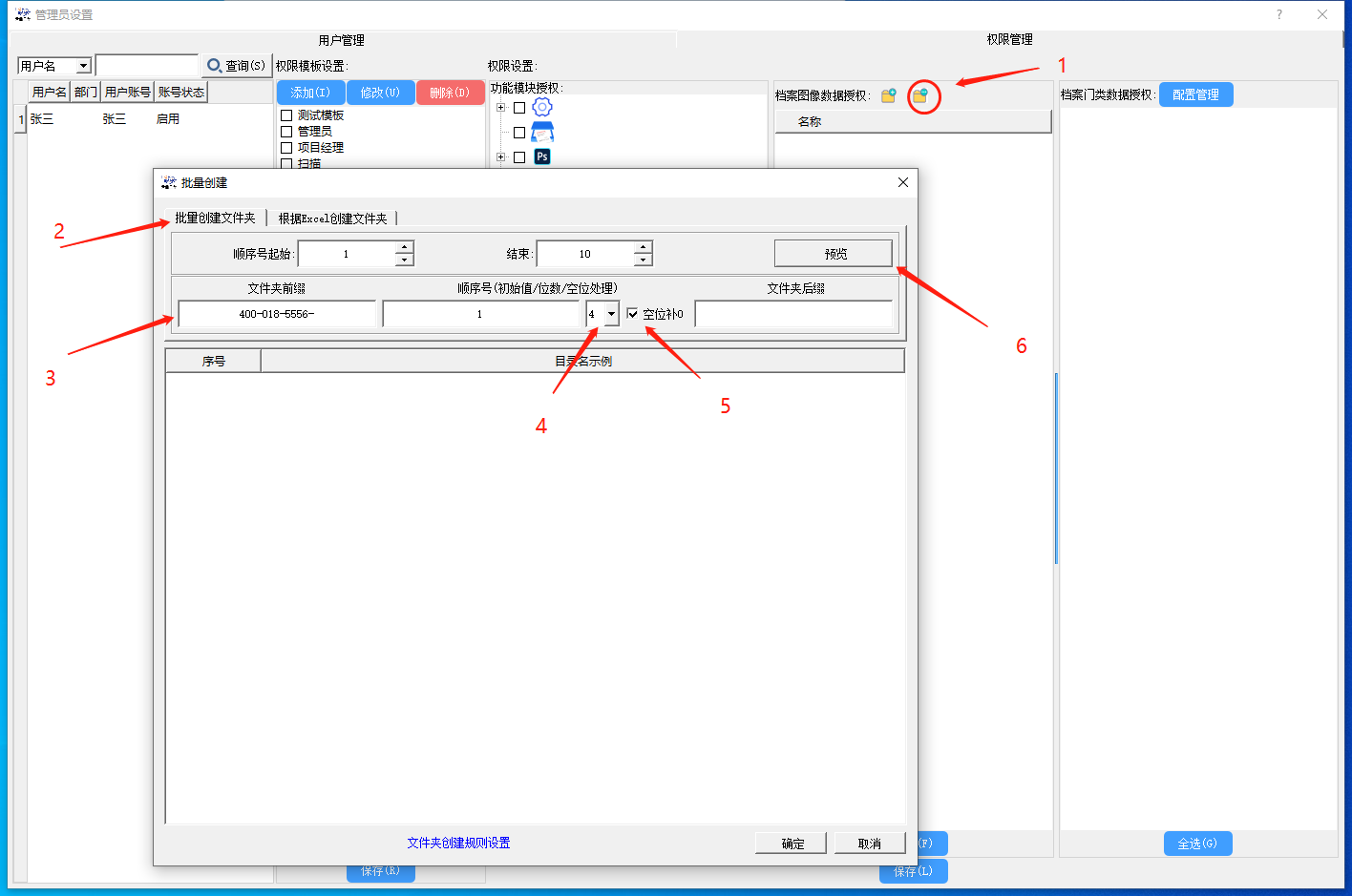 (4)點擊彈出界面的批量創(chuàng)建文件夾,填入文件夾順序的起始號和結(jié)束號,輸入文件夾前綴(文件夾前綴決定新創(chuàng)建的文件夾的層級),選擇順序號的位數(shù),并決定是否空位補(bǔ)零。點擊預(yù)覽,查看目錄名示例是否正確,若正確,點擊確定完成創(chuàng)建。